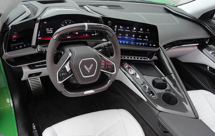 Para 2026, el Corvette presenta un interior renovado. Incluye una interfaz de botones y controles simplificada, una pantalla táctil central más grande y una pantalla adicional para el conductor.